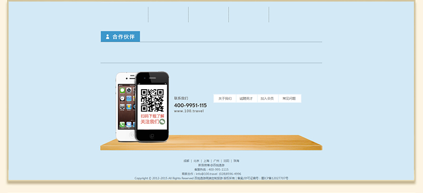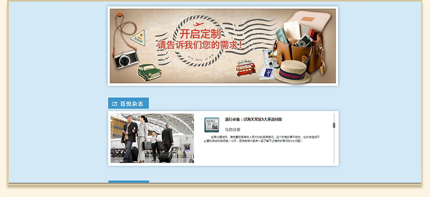 Project Description 百悦逸游于2012年初由二位资深的旅行家创办,是成都传媒集团旗下成都新闻国际旅行社有限公司的高端旅游品牌,总部位于成都高新区天府大道中段美年广场。在百悦逸游成立之前,创始团队亲自到全球三十多个国家实地考察,带着第一手的资讯和执着的信念创立了中国西部第一家真正意义上的私人定制旅行机构。百悦的旅行不是跟团挤大巴,不是十天去十个国家,更不是没完没了的... Official website address 盘锦http://www.100.travel I want to share